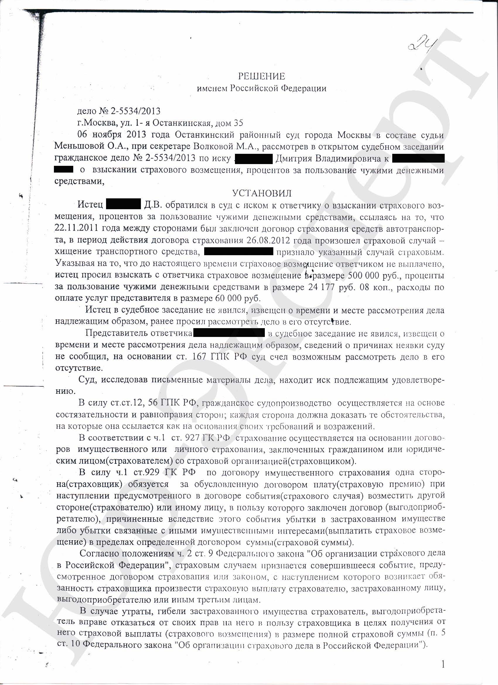 К юристу Зелениной Елене Владимировне обратился гр. Дмитрий Владимирович и рассказал, что хочет взыскать страховое возмещение , проценты за пользование чужими денежными средствами, ссылаясь на то, что 22.11.2011 года между сторонами был заключен договор страхования средств автотранспорта, в период действия договора страхования 26.08.2012 года произошел страховой случай — хищение транспортного средства, ••••••• признало указанный случай страховым. Указывая на то, что до настоящего времени страховое возмещение ответчиком не выплачено, истец просил взыскать с ответчика страховое возмещение размере 5000 000 руб., проценты за пользование чужими денежными средствами в размере 24 177 руб. 08 коп., расходы по оплате услуг представителя в размере 60 000 руб.