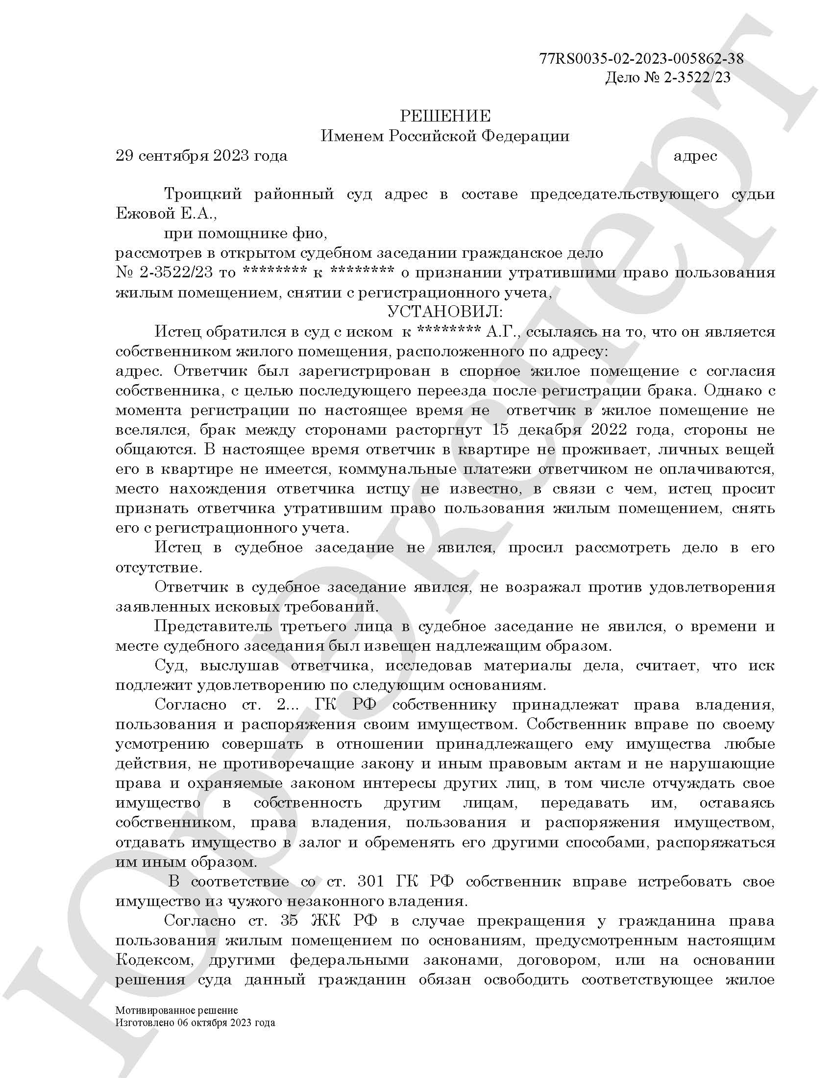 В связи с чем, попросила юриста в судебном порядке признать ответчика утратившим право пользования жилым помещением, снять его с регистрационного учета.