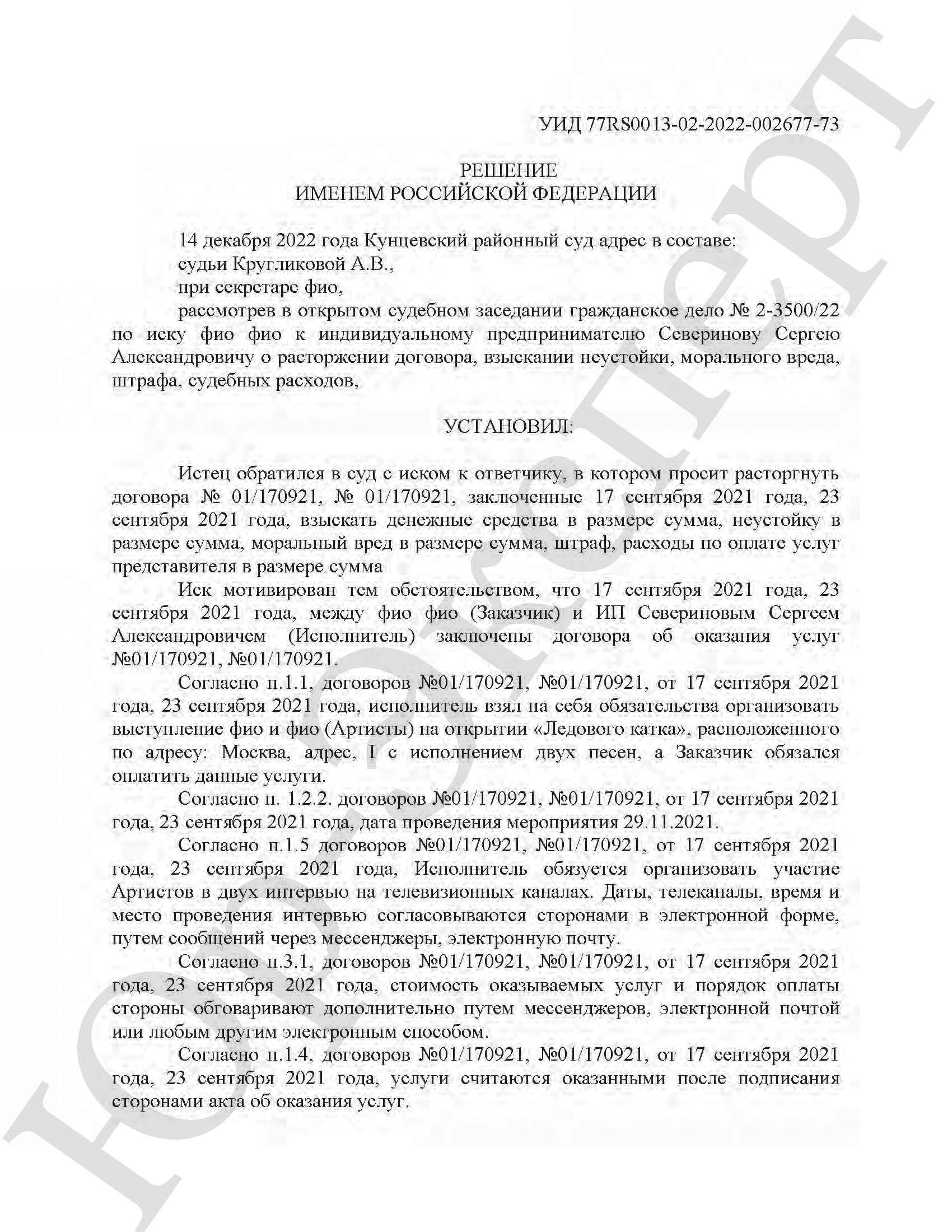 Согласно п.1.1, договоров №01/170921, №01/170921, от 17 сентября 2021 года, 23 сентября 2021 года, исполнитель взял на себя обязательства организовать выступление фио и фио (Артисты) на открытии «Ледового катка», расположенного по адресу: Москва, адрес, I с исполнением двух песен, а Заказчик обязался оплатить данные услуги.