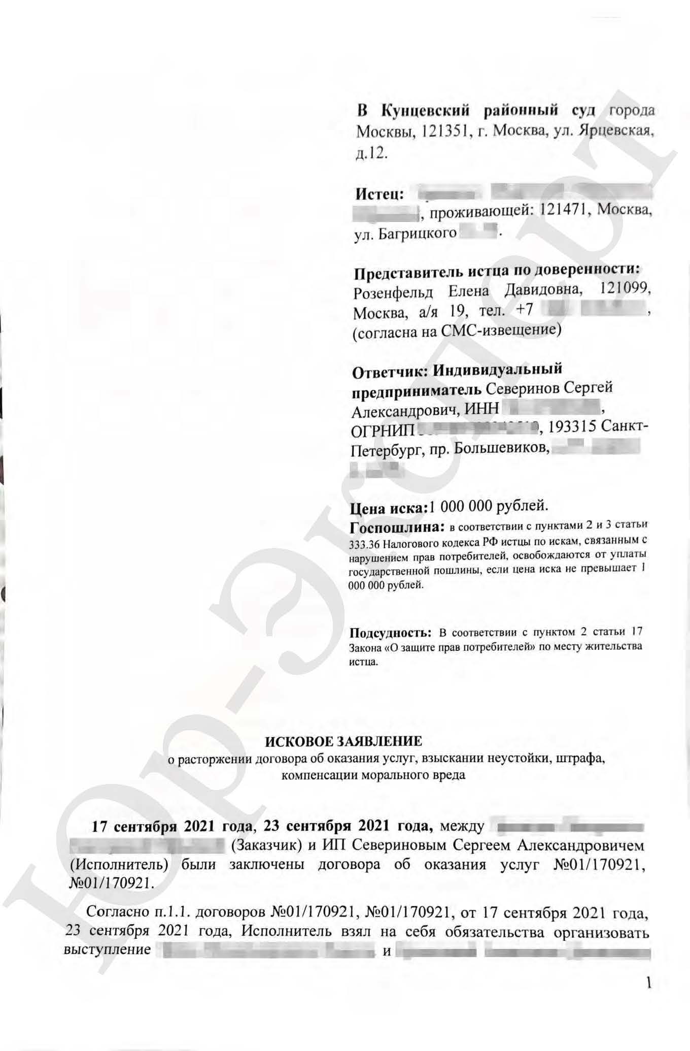 Иск мотивирован тем обстоятельством, что 17 сентября 2021 года, 23 сентября 2021 года, между фио фио (Заказчик) и ИП Севериновым Сергеем Александровичем (Исполнитель) заключены договора об оказания услуг №01/170921, №01/170921.