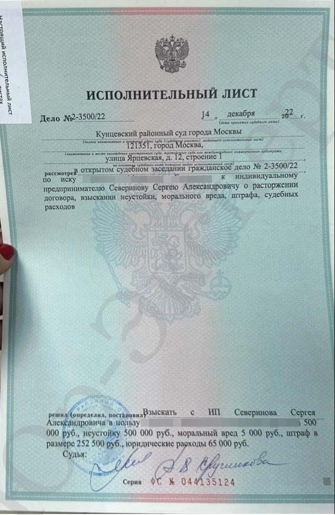 Исполнительный лист на решение суда по делу о о расторжении договора с ИП и взыскании неустойки, штрафа в Кунцевском районном суде.