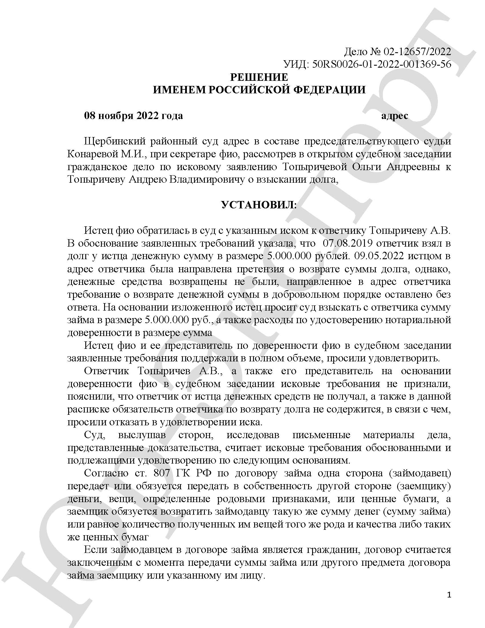 В судебном заседании установлено, и материалами дела подтверждается, что Топыричевым А.В. была составлена расписка о том, что он взял у Топыричевой О.А. 5.000.000 руб. в долг.