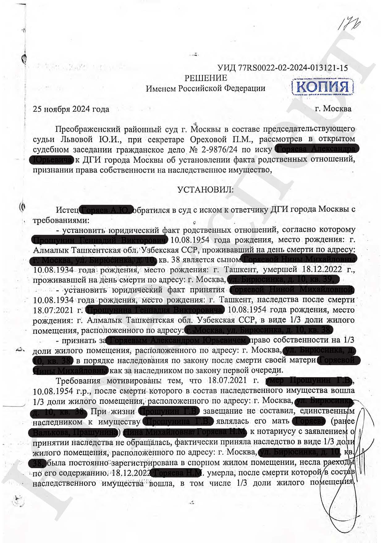 Преображенский районный суд в составе председательствующего судьи Львовой Ю.И., при секретаре, рассмотрел в открытом судебном заседании гражданское дело № 2-9876/24 по иску Г* Александра Юрьевича к ДГИ адрес об установлении факта родственных отношений, признании права собственности на наследственное имущество.