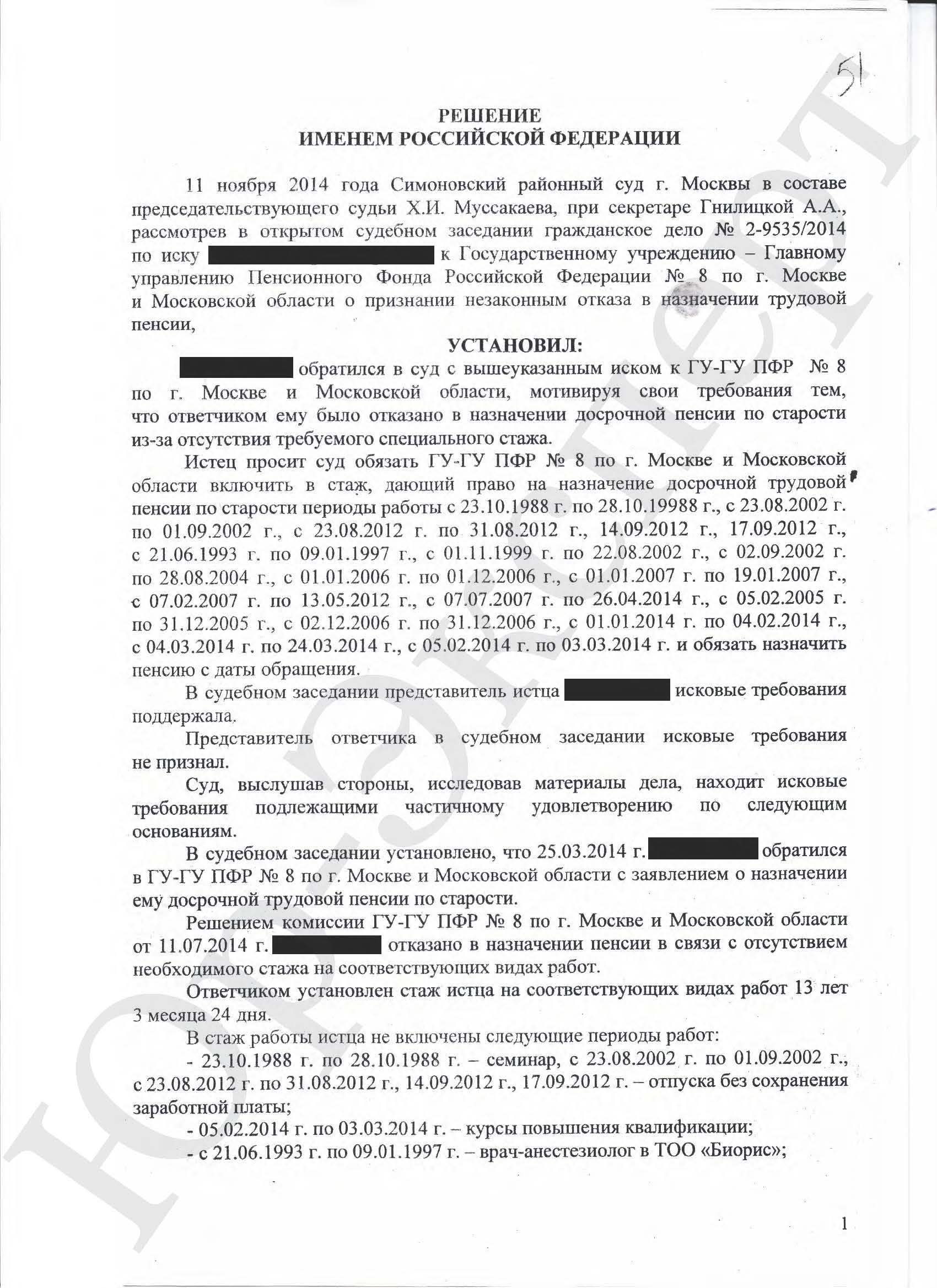 К Юристу Зелениной Елене Владимировне за юридической помощью обратился гр. Б* и рассказал, что ГУ-ГУ ПФР № 8 по г. Москве и Московской области, отказал ему в назначении досрочной пенсии по старости из-за отсутствия требуемого специального стажа.