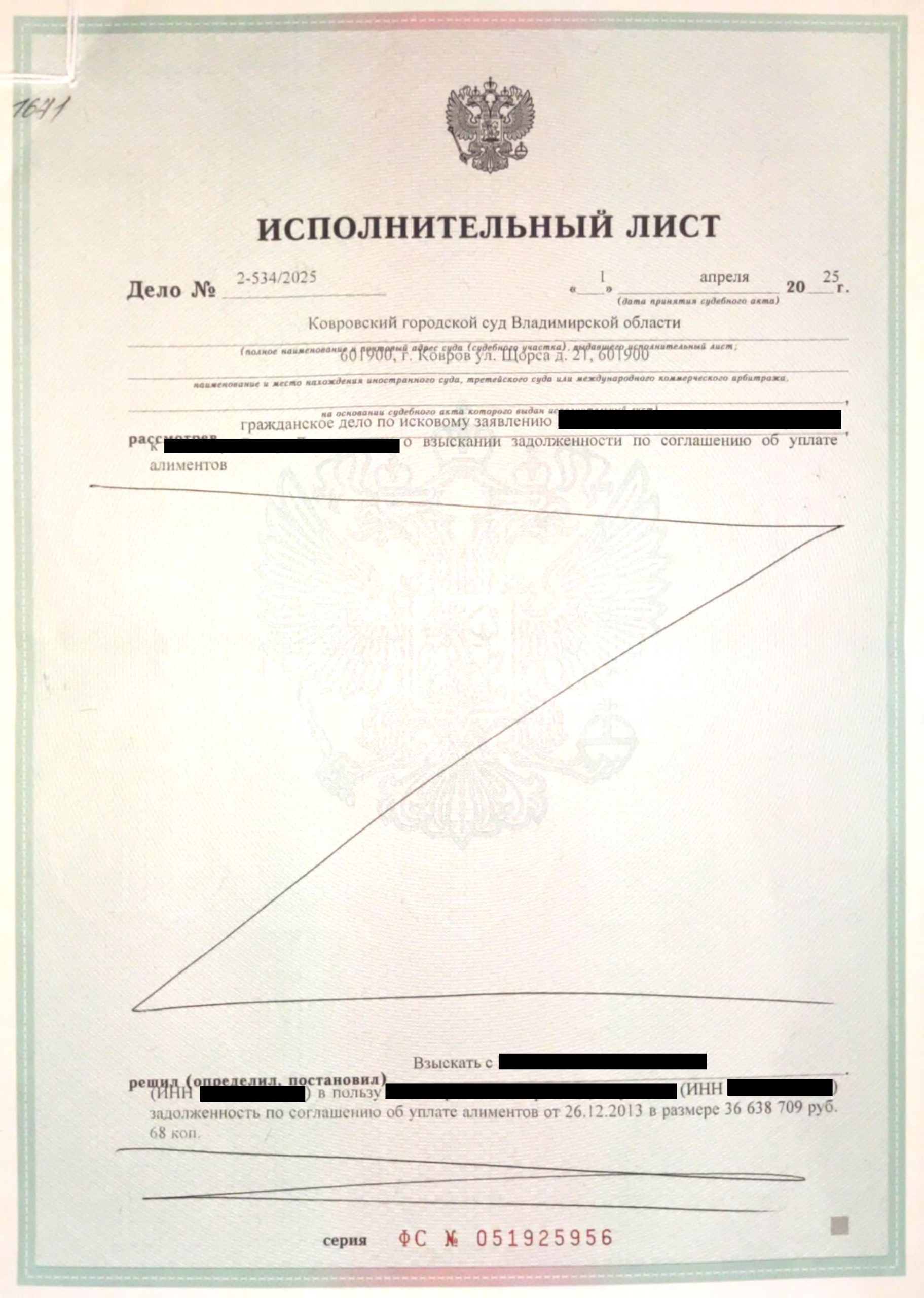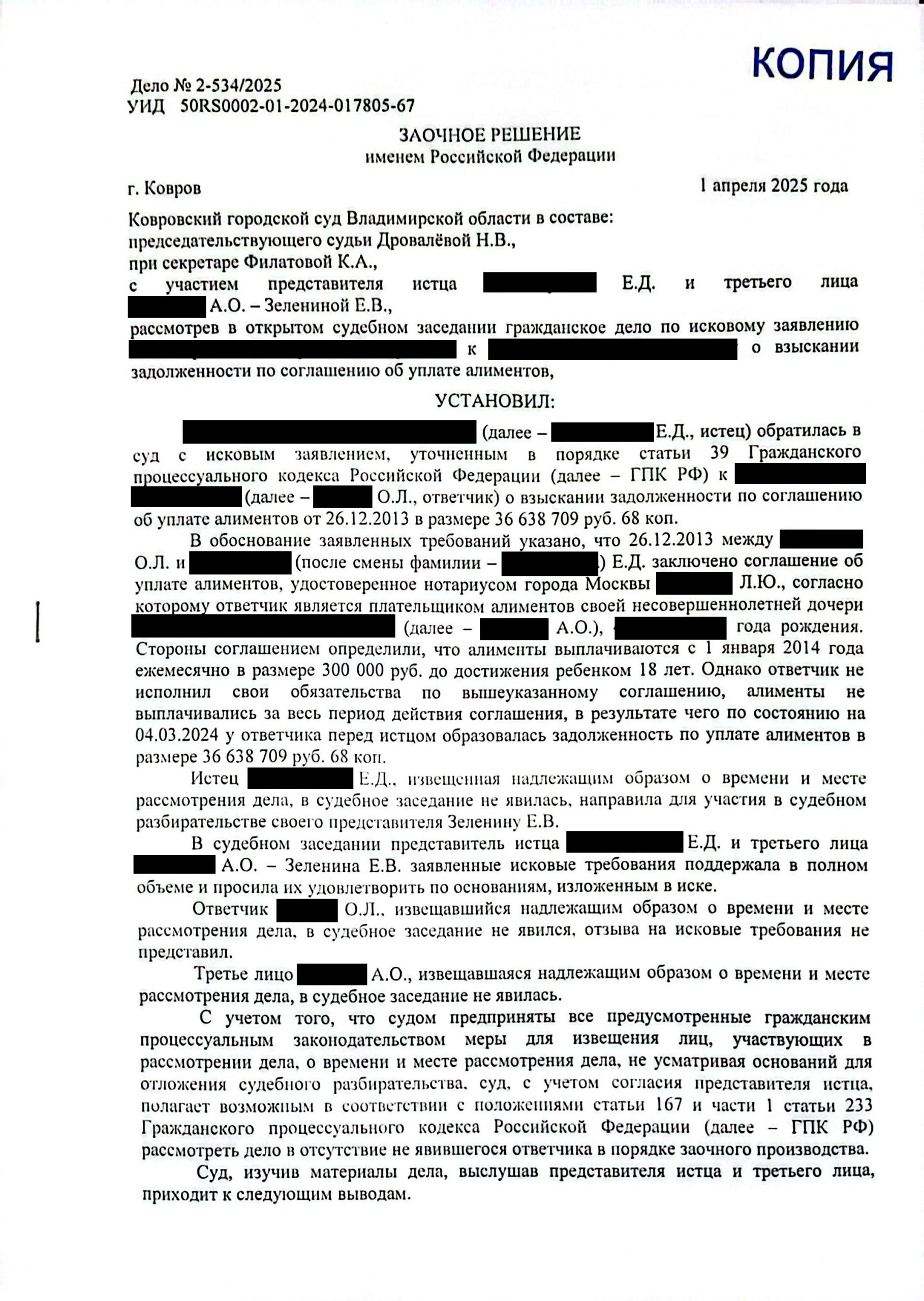 К юристу Зелениной Е.В. обратилась за юридической помощью П*Е*Д*, которая рассказала, что 26.12.2013 г. между В* О* и ней заключено соглашение об уплате алиментов, удостоверенное нотариусом города Москвы Грачевой Л.Ю., согласно которому ответчик является плательщиком алиментов своей несовершеннолетней дочери В*А*О* 4 марта 2006 года рождения. Стороны соглашением определили, что алименты выплачиваются с 1 января 2014 года ежемесячно в размере 300 000 рублей до достижения ребенком 18 лет. Однако, .ответчик не исполнил свои обязательства по вышеуказанному соглашению, алименты не выплачивались за весь период действия соглашения, в результате чего по состоянию на 04.03.2024 г. у ответчика перед истцом образовалась задолженность по уплате алиментов в размере 36 638 709 руб. 68 коп.