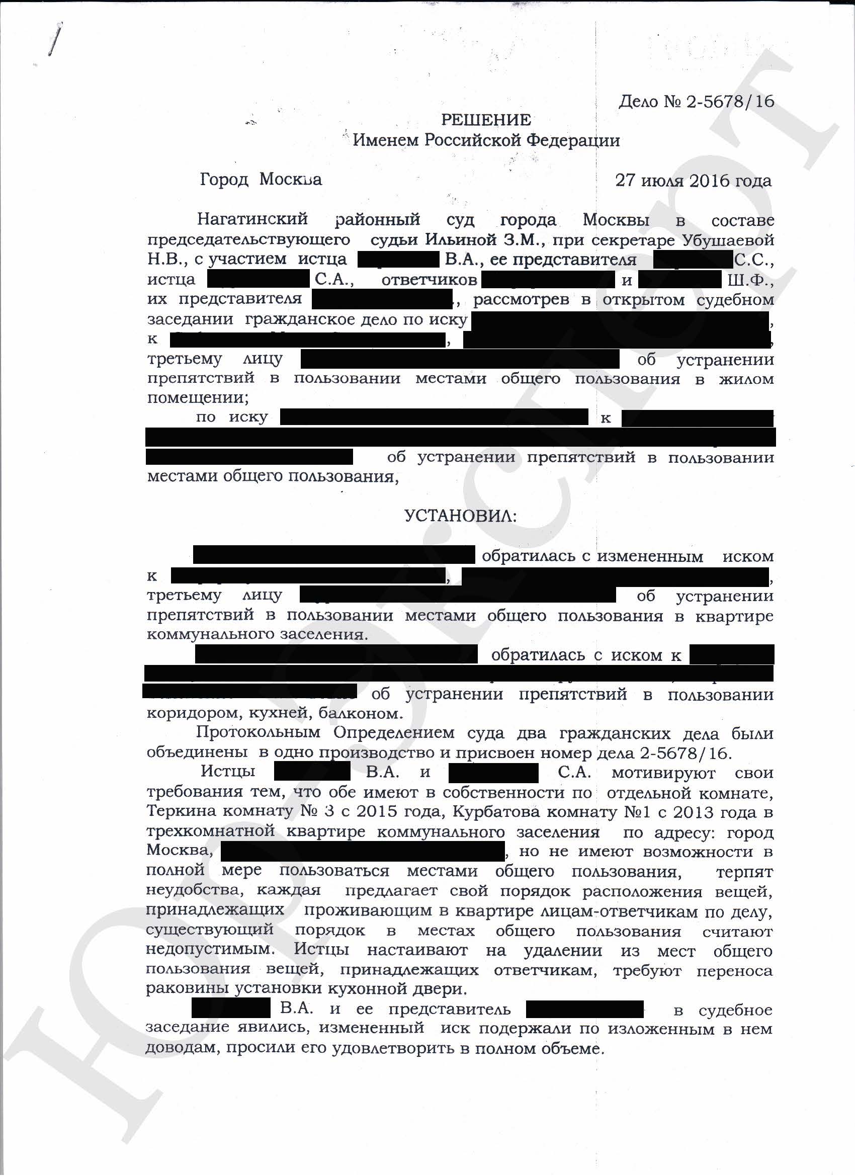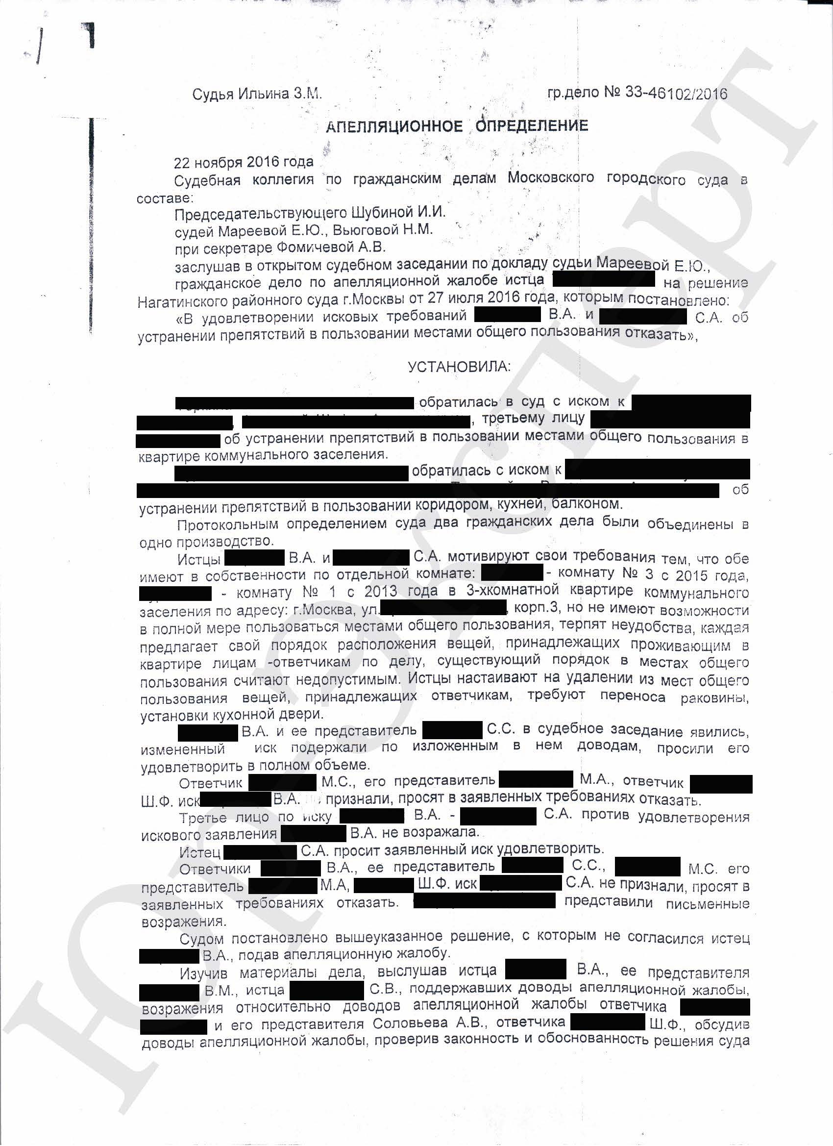 К юристу Зелениной Елене Владимировне за юридической помощью обратились ответчики В.А и С.А.и рассказали, что имеют в собственности по отдельной комнате, комнату № 3 с 2015 года, комнату №1 с 2013 года в трехкомнатной квартире коммунального заселения: по адресу: город Москва, ул.*, истец настаивает на том, что не имеет возможности в полной мере пользоваться местами общего пользования, терпит неудобства, каждый предлагает свой порядок расположения вещей, принадлежащих проживающим в квартире лицам-ответчикам по делу, существующий порядок в местах общего пользования считают недопустимым. Истицы настаивают на удалении из мест общего пользования вещей, принадлежащих ответчикам, требуют переноса раковины и установки кухонной двери.